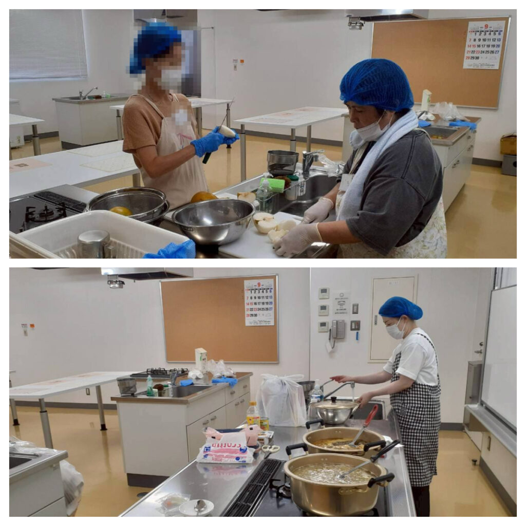 お母さんはボランティアさんと一緒に調理に参加!